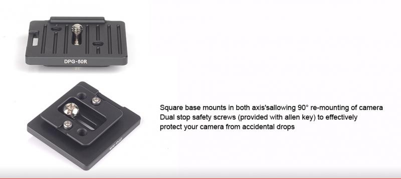 Sunwayfoto® DPG-50R är en Arca-Swiss kompatibel kameraplatta, med kantstöd för kameran. Det som är unikt med DPG-50R plattan är att Arca-Swiss-fästet på undersidan är kvadratiskt, vilket gör det möjligt att montera kameraplattan antingen med lång- eller kortsidan mot dig. På undersidan av kameraplattan finns löstagbara stoppskruvar, som förhindrar att kameraplattan lossnar från snabbfästet av misstag. Kameraplattan levereras med fodral och insexnycklar.