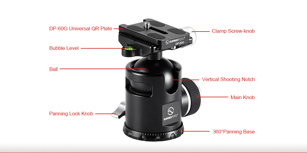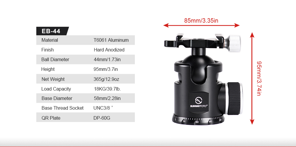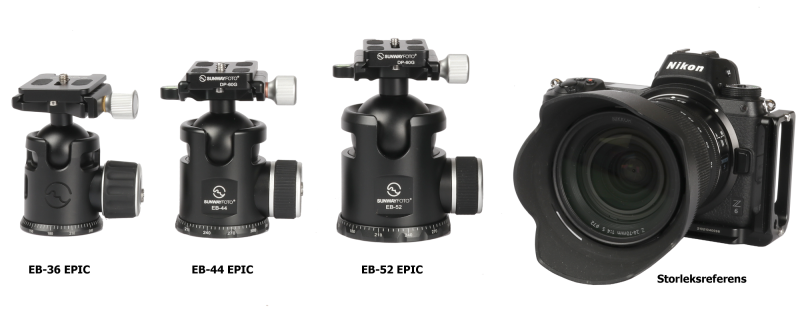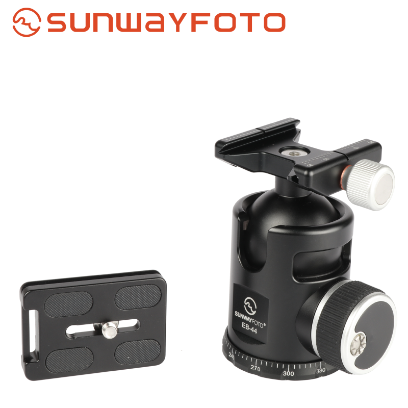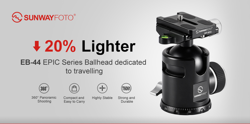 Sunwayfoto® EB-44 Epic Traveller ballhead är en professionell kulled, med en unik datorberäknad design, som gör kulleden cirka 20% lättare än en traditionell kulled (i samma storlek) utan att påverka funktionen eller låsningen. Varje onödigt gram från kulleden och snabbfästet har plockats bort, vilket gör kulleden till ett perfekt val för fjällvandringen eller för resefotografen som vill prioritera en kompakt kulled med låg vikt. Sunwayfoto® EB-44 är "Mellan-kulleden" i Epic-serien. Vikten är endast 365g. Kulleden har förutom Arca-Swiss kompatibelt snabbfäste, även ställbar friktion på kulan och en graderad panoramabas. Snabbfästet levereras komplett med en Sunwayfoto® DP-60G kameraplatta, som har standard 1/4" kameragänga. På undersidan av kameraplattan finns "stoppskruvar", som extra säkerhet.