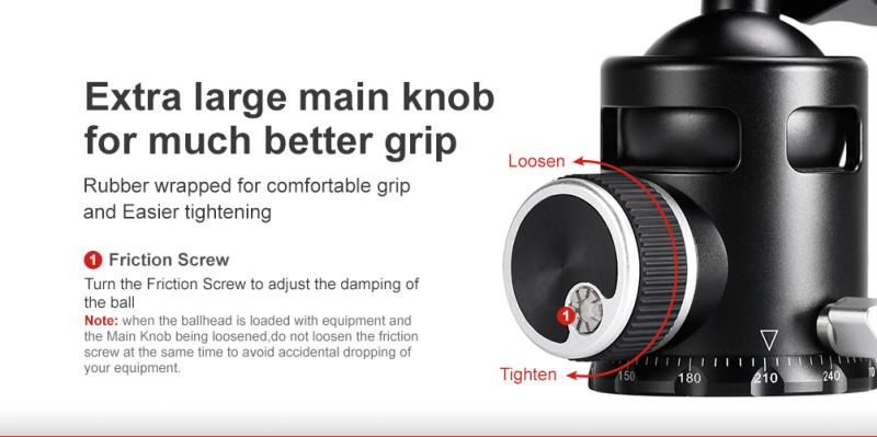 Kulleden har ställbar tröghet, så att man kan anpassa friktionen på kulan efter belastningen. Inställningen av trögheten görs via den lilla ratten, som sitter på låsratten. Kulleden har urtag för fällning av kameraplattan 90° för fotografering med kameran i "höjdformat". Kulleden har standard 3/8" gänga i botten. (Fyllnadsskruv för 1/4" gänga ingår.)