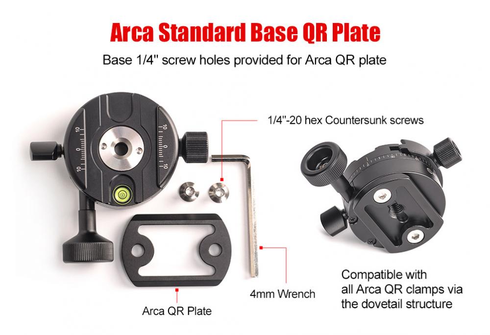 På undersidan av panoramahuvudet finns ett Arca Swiss Dovetail-fäste, som gör det möjligt att montera panorama-huvudet direkt på t.ex ett Arca-Swiss kompatibelt snabbfäste eller andra kompatibla tillbehör. Det går även att skruva bort Dovetail-fästet, så att panoramahuvudet får standard 3/8" gänga i botten. (Ej genomgående 3/8" gänga).
