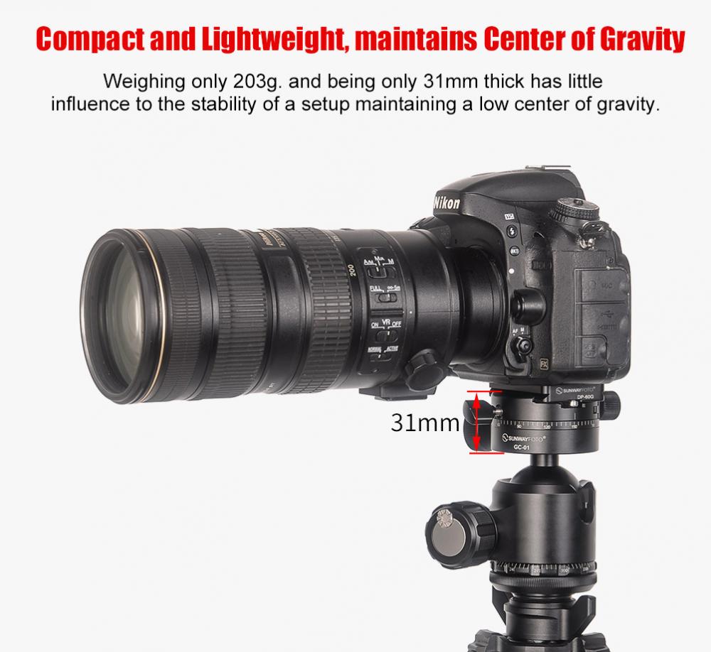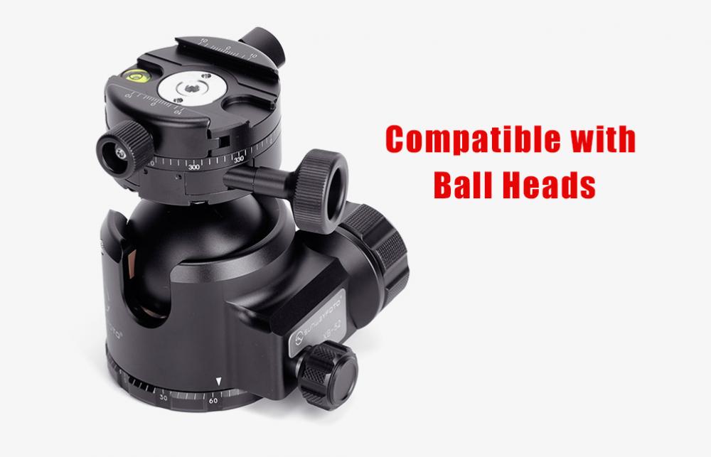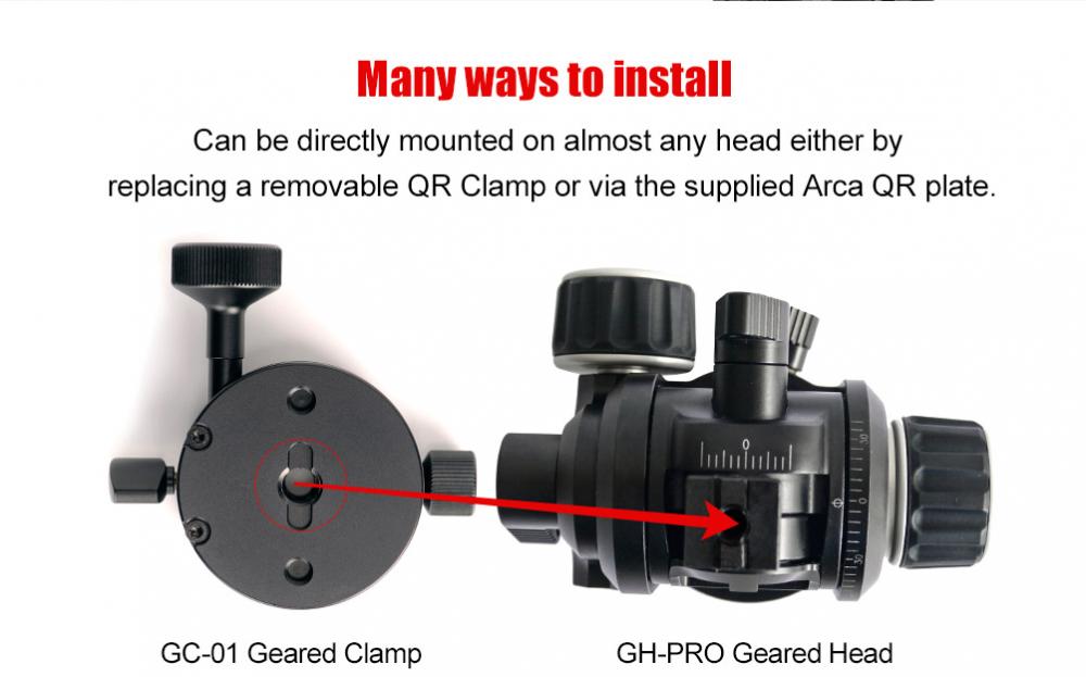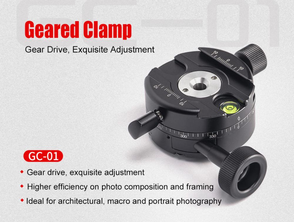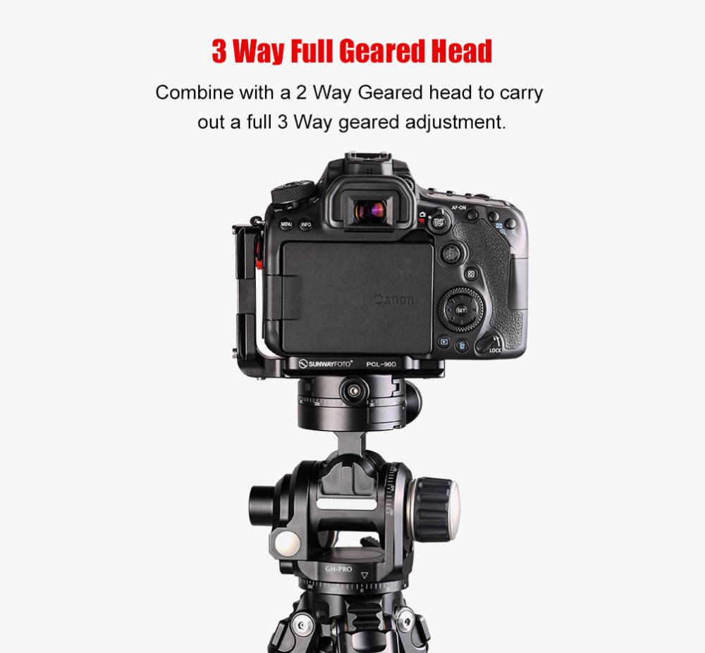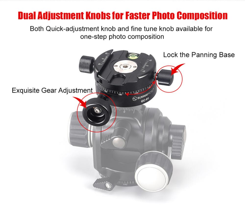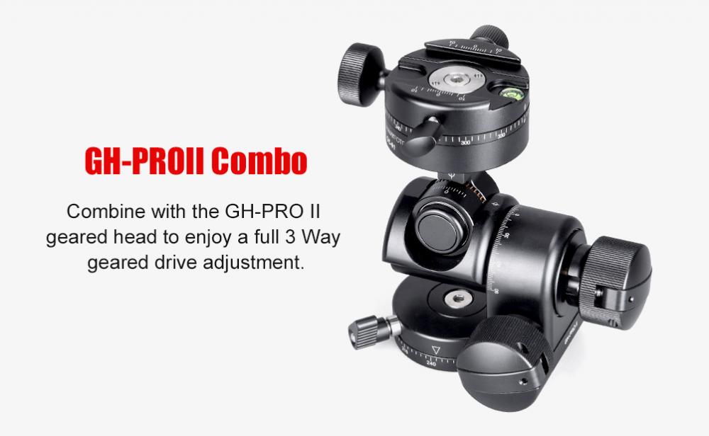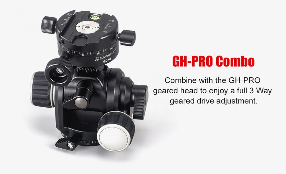 Sunwayfoto® GC-01 Gear Panning head är kompatibelt med Sunwayfoto® Gear Head GH-PRO II (ingår ej). Det går nämligen att ersätta det befintliga panoramahuvudet på Gear Head GH-PRO II med GC-01 Gear Panning head, vilket ger ett 3-vägs huvud med mekanisk precions-inställning i tre riktningar.