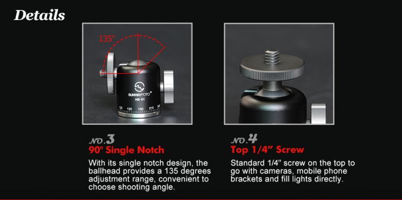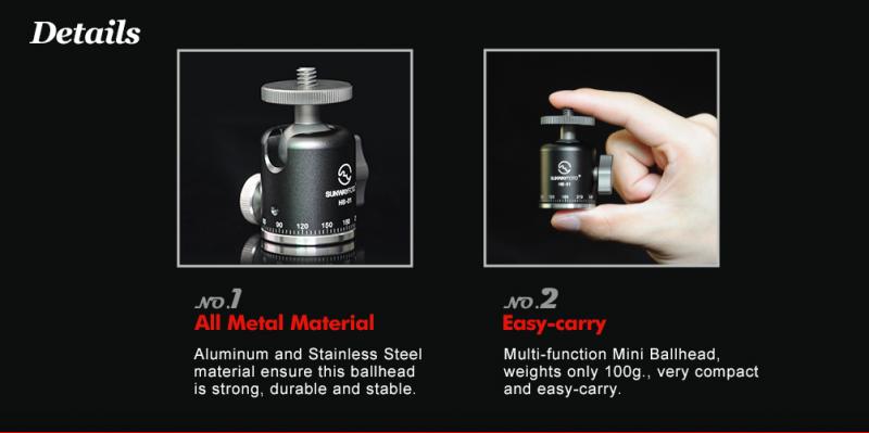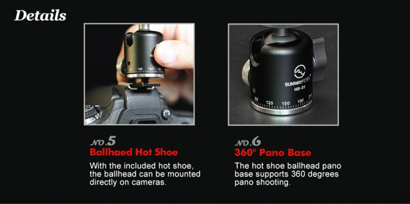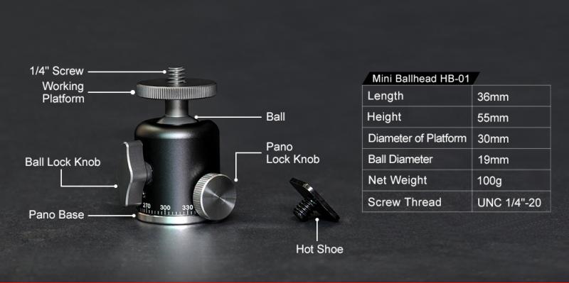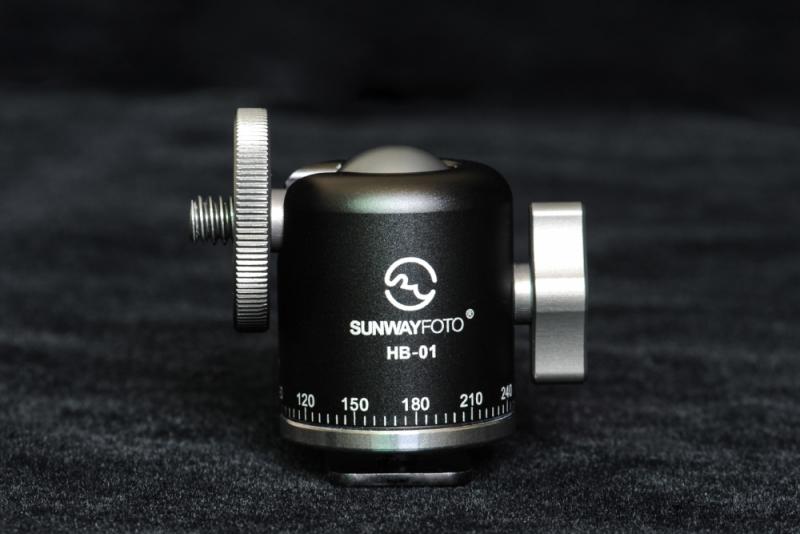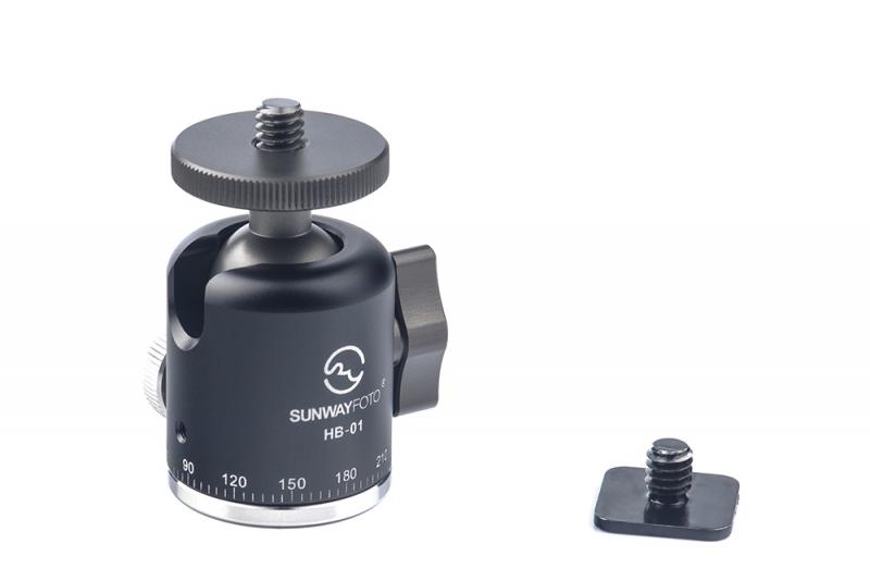 Sunwayfoto HB-01 är en smidig minikulled, som är tillverkad i aluminium och rostfritt stål. Kulleden har graderad 360° panoramabas (med separat låsning) och ett urtag för fällning i 90° för fotografering i höjdformat. Vikten på kulleden är bara 100g. Tack vare att det följer med en avtagbar blixtfot till kulleden, så kan man fästa kulleden i t.ex kamerans blixtsko för att hålla fast en belysning. På ovansidan och undersidan av kulleden finns standard 1/4" kameragänga.