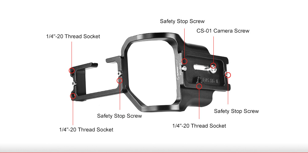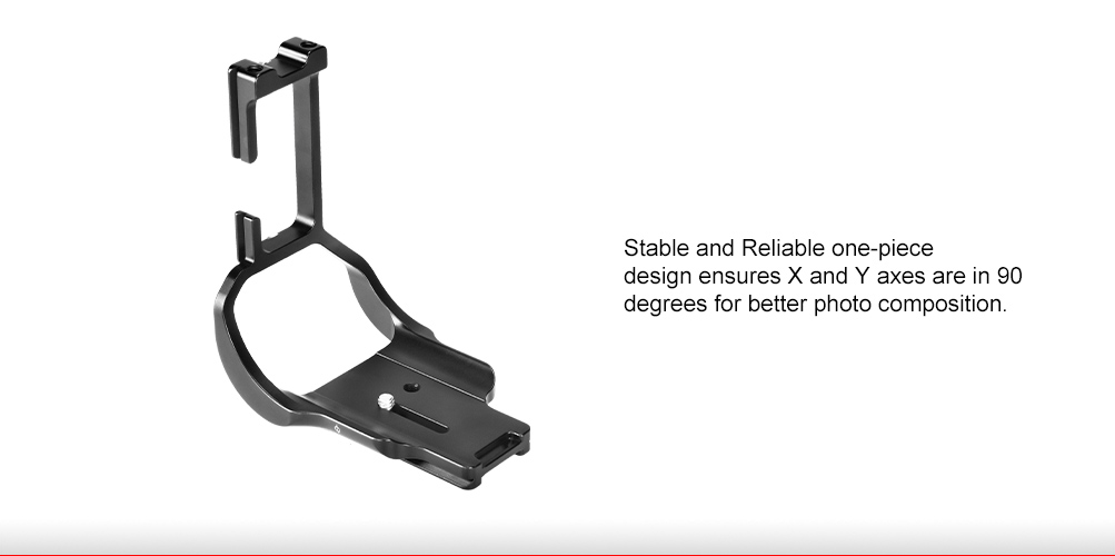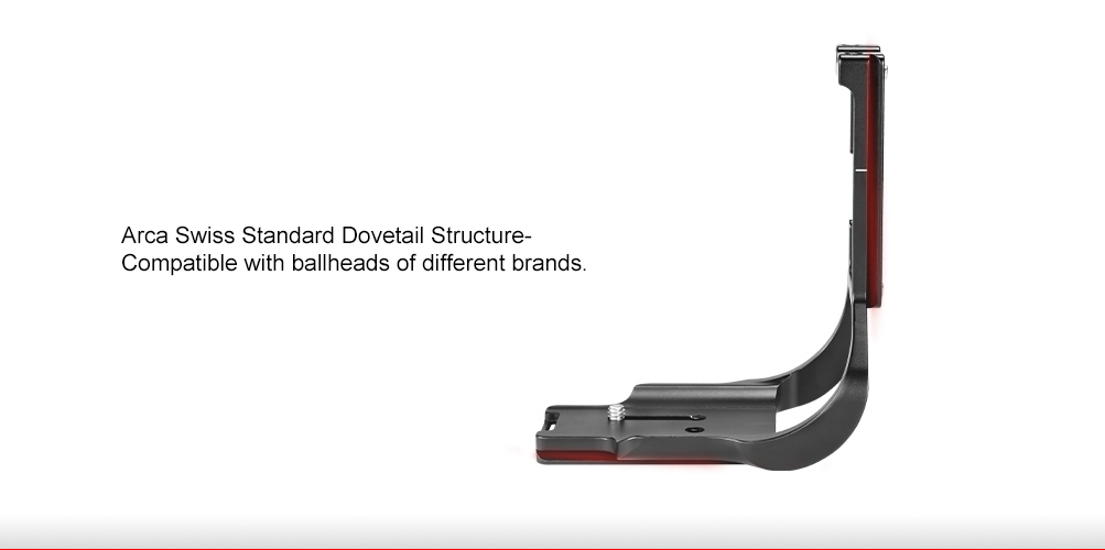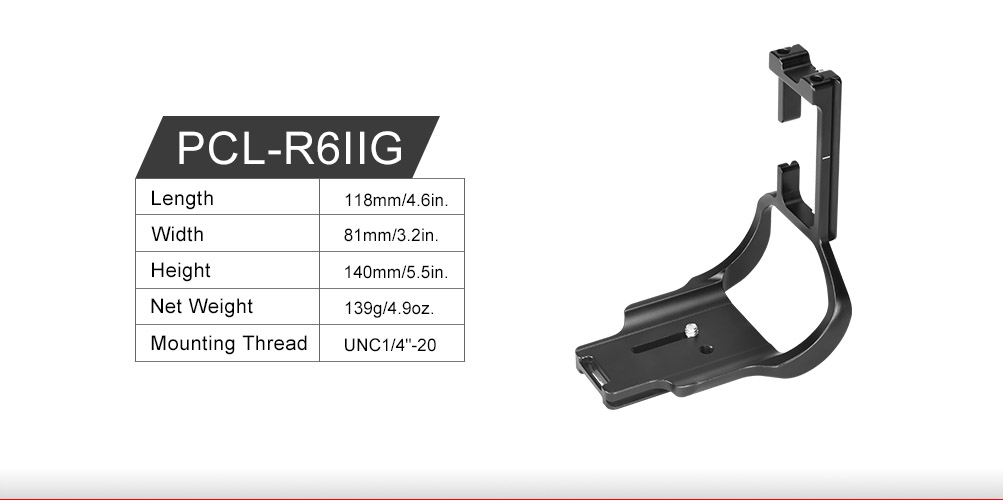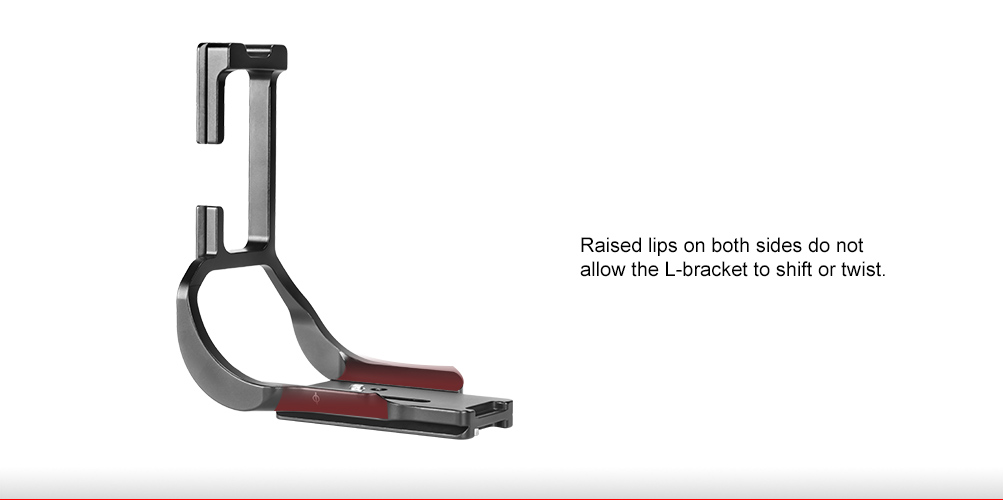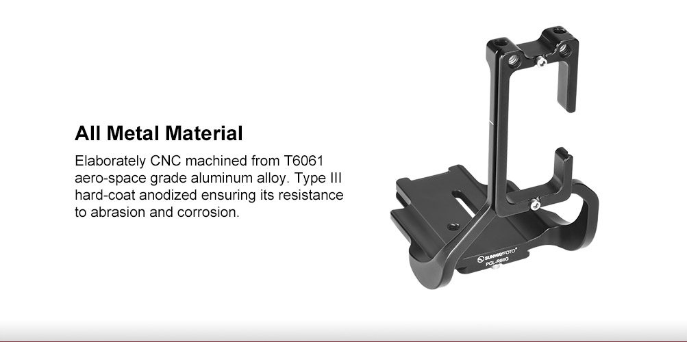 Sunwayfoto® PCL-R6IIG är tillverkat i en T6061 aluminiumlegering (solitt stycke), med en hårdanodiserad yta (typ III), som uppfyller extremt höga krav på korrosionsbeständighet och hållbarhet. Till skillnad från universalfästen, så har L-fästet anpassad design efter kameran, som gör det möjligt att t.ex rotera skärmen obehindrat. L-fästet är även försedd med dubbla stödkanter, som ser till att kameran inte kan vrida sig. L-fästet är försedd med Arca-Swiss Dovetail spår för montering i Arca-Swiss kompatibla snabbfästen (Snabbfäste ingår ej). På undersidan av kameraplattan finns två stoppskruvar, som kan lossas med insexnyckel. Tack vare att kameraskruven löper i ett spår (Captive-slot-design), så kan man ställa in kamerans position i sidled. L-fästet är också försedd med extra 1/4" gänga, som gör det möjligt att bygga ut L-fästet med andra tillbehör som t.ex blixtskofäste. Det finns en avlång urfräsning på ena kortsidan, där det är möjligt att fästa t.ex en rem. (Rem ingår ej.)