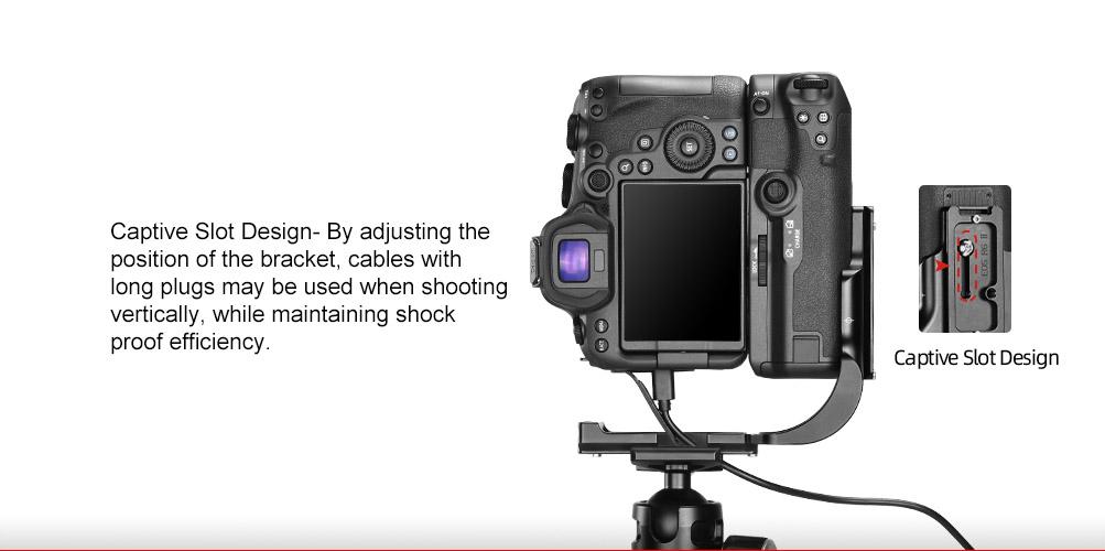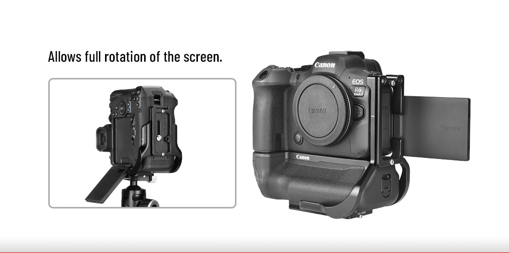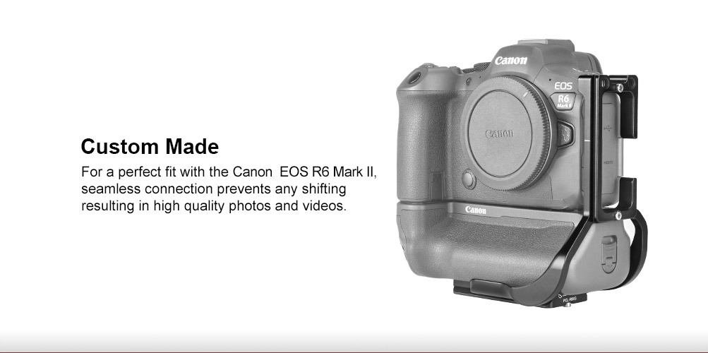 Sunwayfoto® PCL-R6IIG är ett Arca-Swiss kompatibelt L-fäste (L-Bracket) för Canon EOS R6 II (med batterigrepp), som gör det möjligt att t.ex snabbt växla från landskap- till höjdformat när man fotograferar. PCL-R6IIG är en specialdesignad L-Bracket för Canon R6 Mark II (med batterigrepp), så att man får perfekt passform på L-fästet och smidig tillgång till uttagen för datakablar, batteri mm.