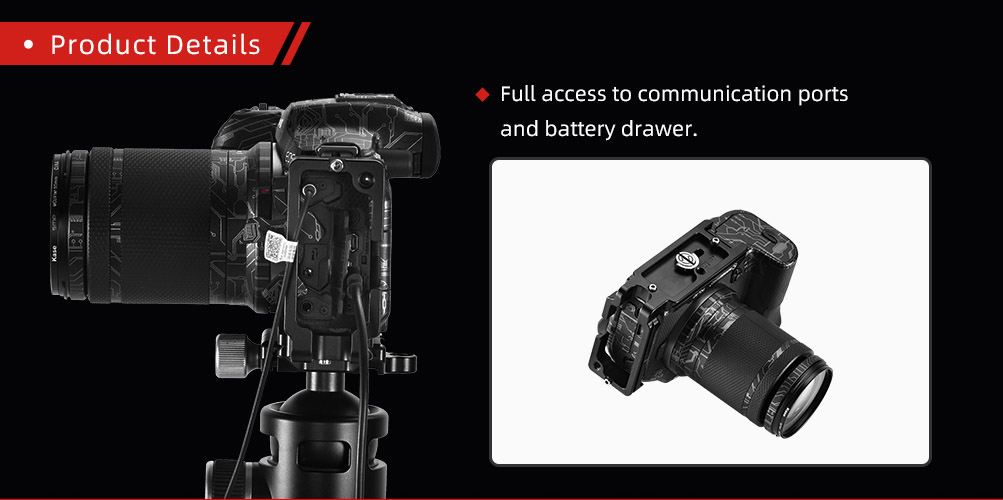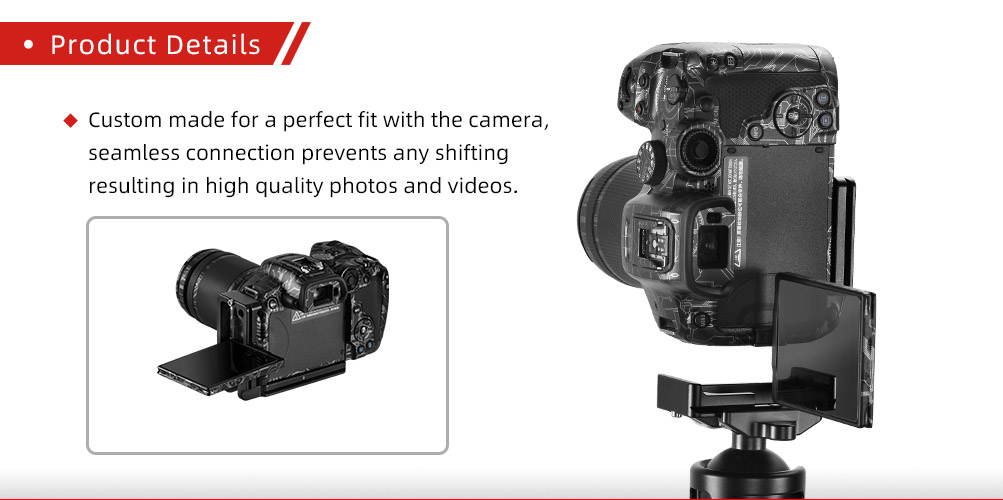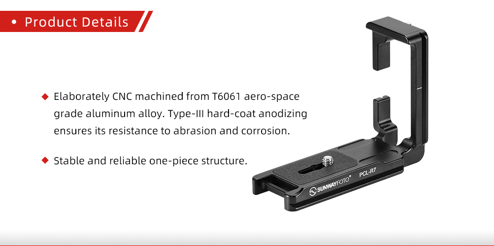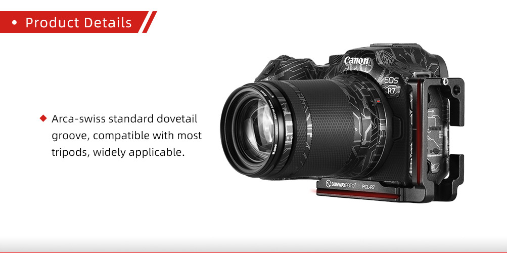 Sunwayfoto® PCL-R7 är ett Arca-Swiss kompatibelt L-fäste (Custom L-Bracket) för Canon EOS R7, som gör det möjligt att t.ex snabbt växla från landskap- till höjdformat när man fotograferar. PCL-R7 är en specialdesignad L-Bracket för Canon EOS R7, så att man får perfekt passform på L-fästet och smidig tillgång till uttagen för datakablar, batteri mm. L-fästet har "one-piece"-design, dvs att det är tillverkat av ett solitt stycke T6061 aluminium, vilket ger en extrem robust och stabil konstruktion. Dessutom har L-bracket en hårdanodiserad yta, som uppfyller mycket höga krav på korrosionsbeständighet och hållbarhet.