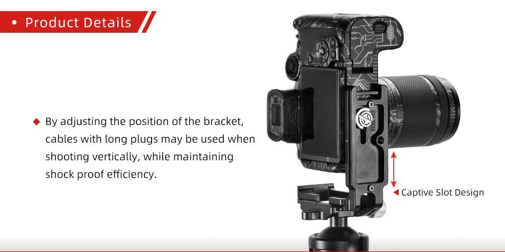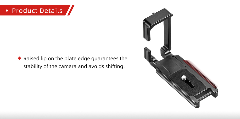 Till skillnad från universalfästen, så har L-fästet anpassad (dedikerad) design efter kameran, som gör det möjligt att t.ex rotera skärmen. L-fästet är även försedd med en stödkant, som ser till att kameran inte kan vrida sig. L-fästet är försedd med Arca-Swiss Dovetail spår för montering i Arca-Swiss kompatibla snabbfästen (Snabbfäste ingår ej). På undersidan av kameraplattan finns två stoppskruvar, som kan lossas med insexnyckel. Tack vare att kameraskruven löper i ett spår, så kan man ställa in kamerans position i sidled. L-fästet är också försedd med extra 1/4" gänga på ena sidan, som gör det möjligt att bygga ut L-fästet med andra tillbehör som t.ex blixtskofäste. På undersidan finns 1/4" gänga. Det finns även en avlång urfräsning på ena kortsidan, där det är möjligt att fästa t.ex en rem.