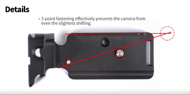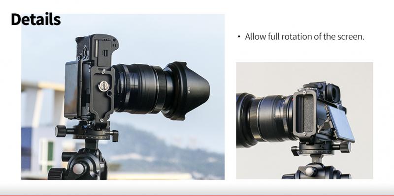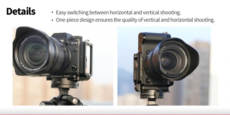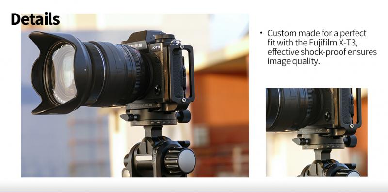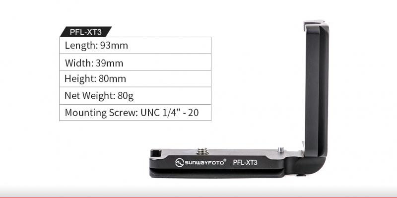 Sunwayfoto® PFL-XT3 är ett Arca-Swiss kompatibelt L-fäste (L-Bracket) för Fujifilm X-T3 som gör det möjligt att t.ex snabbt växla från landskap- till höjdformat när man fotograferar. PFL-XT3  är en specialdesignad L-Bracket för Fujifilm X-T3, så att man får perfekt passform på L-fästet och smidig tillgång till uttagen för fjärrkontroll och datakablar, batteri mm. Till skillnad från universalfästen, så har L-fästet en avfasning i bakkant, som gör att skärmen på Fuji X-T3 kan fällas in/ut och vinklas utan problem.  L-fästet är även försedd med en stödkant (på framsidan), som ser till att kameran inte kan vrida sig. Förutom stödkanten så har L-fästet även en "alignment pin", som ser till att kameran alltid är parallell mot skenan.
