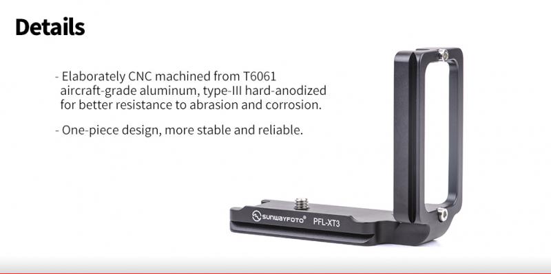 Sunwayfoto® PFL-XT3 är tillverkat i T6061 aluminiumlegering, med en hårdanodiserad yta (typ III), som uppfyller militära specifikationer på korrosionsbeständighet och hållbarhet. Kameraskruven, med standard 1/4" kameragänga, är tillverkad i rostfritt stål. L-fästet är försedd med Arca-Swiss Dovetail spår för montering i Arca-Swiss kompatibla snabbfästen (Snabbfäste ingår ej).  L-fästet levereras med fyra stoppskruvar (fungerar som säkringar), som kan lossas med insexnyckel. En annan smart funktion med L-fästet är att den har en avlång urfräsning på ena kortsidan, där det är möjligt att fästa t.ex en rem. .