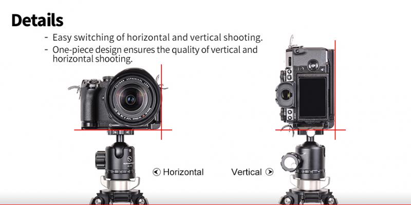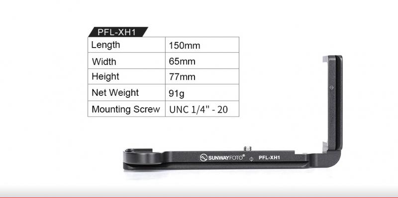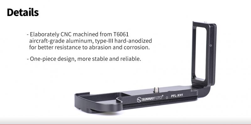 Sunwayfoto® PFL-XH1 är ett Arca-Swiss kompatibelt L-fäste (L-Bracket) för Fujifilm X-H1 som gör det möjligt att t.ex snabbt växla från landskap- till höjdformat när man fotograferar. PFL-XH1 är en specialdesignad L-Bracket för Fujifilm X-H1, så att man får perfekt passform på L-fästet och smidig tillgång till uttagen för fjärrkontroll och datakablar, batteri mm. Sunwayfoto® PFL-XH1 är tillverkat i T6061 aluminiumlegering, med en hårdanodiserad yta (typ III), som i princip uppfyller militära specifikationer på korrosionsbeständighet och hållbarhet. L-fästet är även försedd med en stödkant (på framsidan), som ser till att kameran inte kan vrida sig. Till skillnad från universalfästen, så har L-fästet en avfasning i bakkant, som gör att skärmen på Fujifilm X-H1 kan fällas in/ut och vinklas utan problem. L-fästet är även försedd med en stödkant (på framsidan), som ser till att kameran inte kan vrida sig.