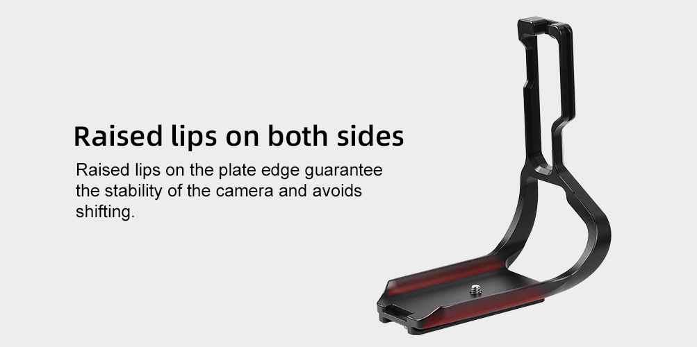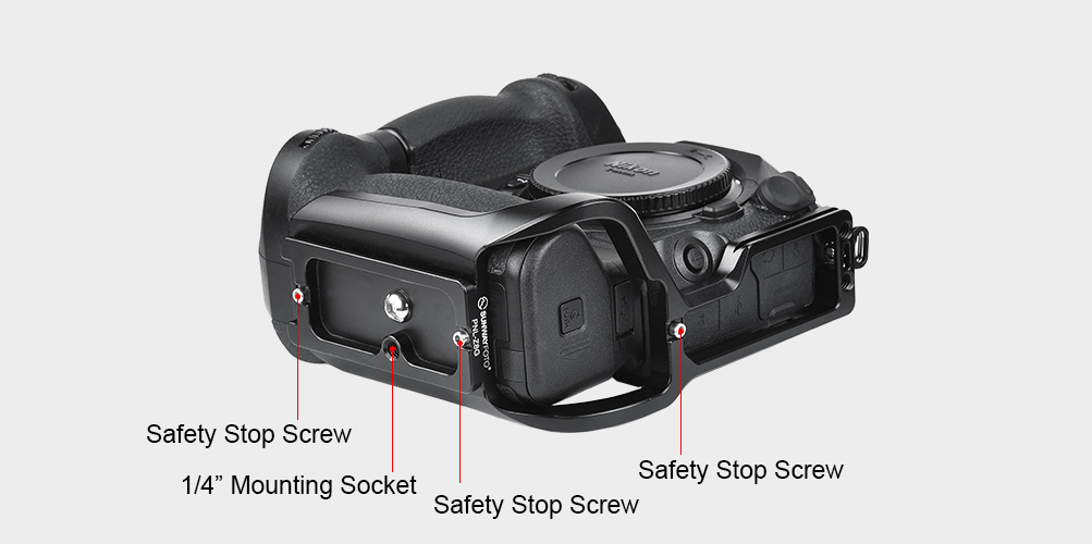 På undersidan av kameraplattan finns två stoppskruvar, som kan lossas med insexnyckel. L-fästet är också försedd med extra 1/4" gänga på ena sidan, som gör det möjligt att bygga ut L-fästet med andra tillbehör som t.ex blixtskofäste. På undersidan finns både 3/8" och 1/4" gängor. Det finns även en avlång urfräsning på ena kortsidan, där det är möjligt att fästa t.ex en rem.