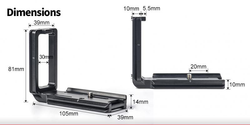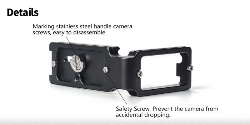 L-fästet är försedd med Arca-Swiss Dovetail spår för montering i Arca-Swiss kompatibla snabbfästen (Snabbfäste ingår ej). På undersidan av kameraplattan finns två stoppskruvar, som kan lossas med insexnyckel. Tack vare att kameraskruven (standard 1/4") löper i ett spår, så går det även att ställa in kamerans position i sidled. En annan smart funktion med L-fästet är att den har en avlång urfräsning på ena kortsidan, där det är möjligt att fästa t.ex en rem.