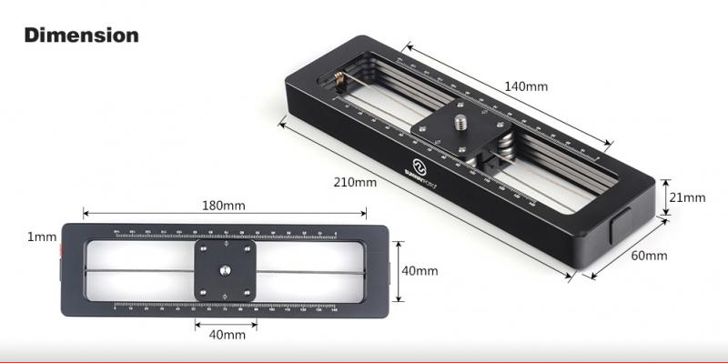 Sunwayfoto M1 Micro-slip rail är en "mobilskena", med japanska kullager, som ger en extrem mjuk och tyst förflyttning av kameraplattan på skenan. Perfekt att använda när man filmar med smartphone. (Smartphone-hållare finns som tillbehör). Tack vare en sinnrik konstruktion där den undre plattformen förflyttas automatiskt åt motsatt riktning som den övre plattformen, så får man dubbla räckvidden mot en normal skena (Se bild). Total förflyttning blir 28cm. Den undre plattformen har 3/8" gänga för montering på t.ex stativ eller kulled. Det följer med en fyllnadsskruv (1/4") och ett Arca-Swiss kompatibelt Dove-tail-fäste som kan monteras på undersidan. Det går även att placera skenan på ett bord, då skenan har gummifötter i hörnen. Skenen är tillverkat i en T6061 aluminiumlegering, med en anodiserad yta, som uppfyller höga krav på korrosionsbeständighet och hållbarhet . Kullager från japanska NSK. Max belastning: 0.8 Kg.