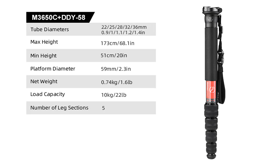 SUNWAYFOTO M3650C CARBON FIBER MONOPOD & DDY58