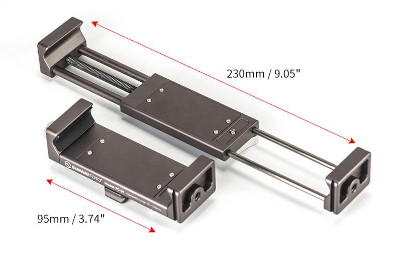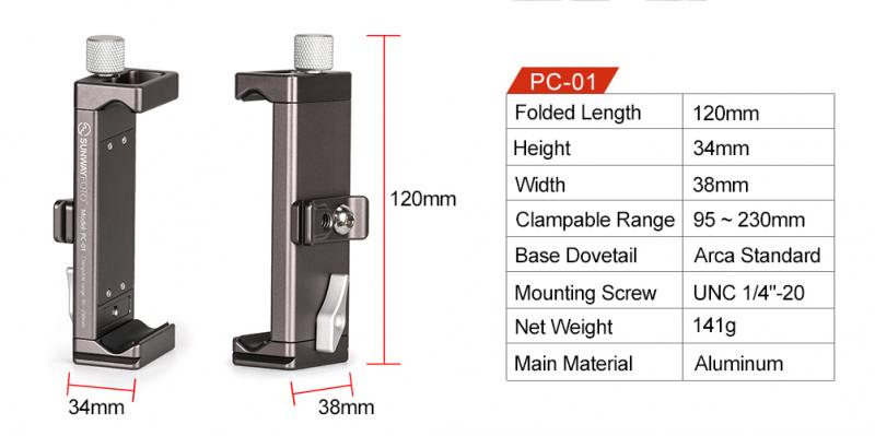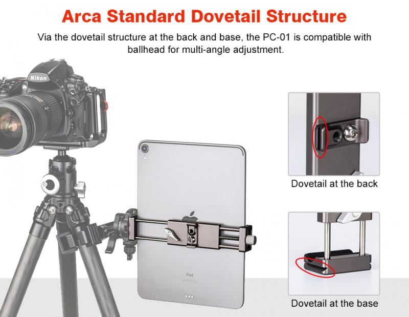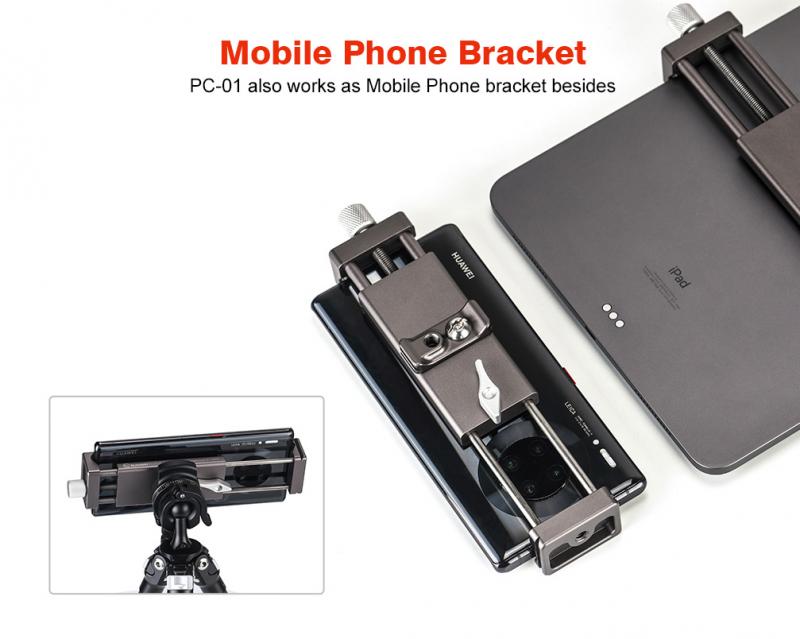 Sunwayfoto® PC-01 är en Arca-swiss kompatibel universalhållare för surfplattor (och smartphones), med ställbar gripvidd (95-230mm) för att passa de flesta surfplattor på marknaden. Hållaren är tillverkad i T6061 aluminiumlegering, med en hårdanodiserad yta (typ III), som i princip uppfyller militära specifikationer på korrosionsbeständighet och hållbarhet. Fästet är försedd med både standard 1/4" kameragänga (för t.ex montering på stativ) och Dovetail-spår för montering på ett Arca-Swiss kompatibelt snabbfäste! Låsning av klämman sker genom att man skruvar på låsratten, som naturligtvis också är av metall. Klämman är utdragbar åt två håll, på ena sidan finns en låsratt och på baksidan ett låsvred. Detta är en Sunwayfoto produkt, så den håller extremt hög kvalitè och finish. Varje exemplar har ett unikt serienummer, som är ingraverat i aluminiumet. Hållaren har gummerade anläggningsytor för att inte repa din surfplatta eller mobiltelefon.