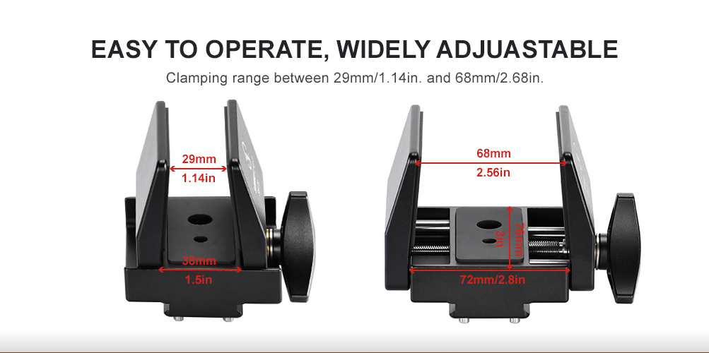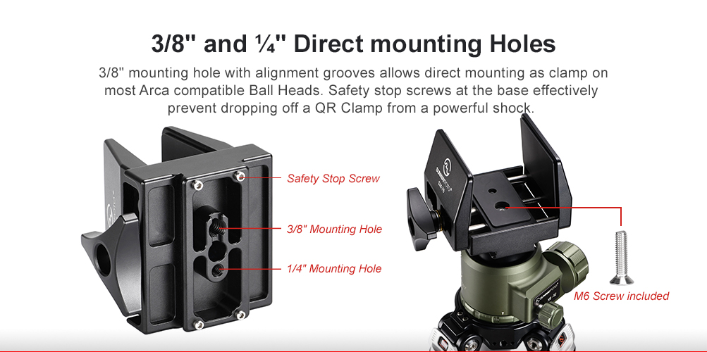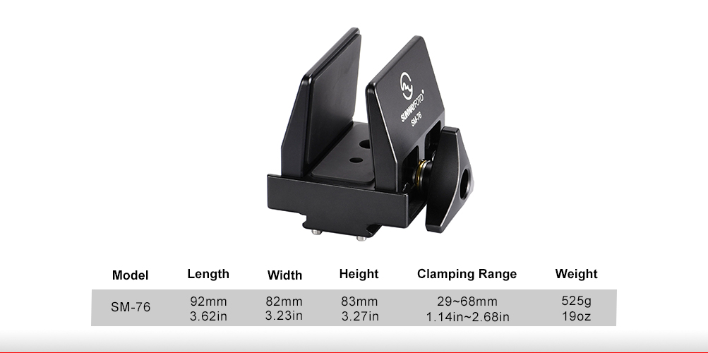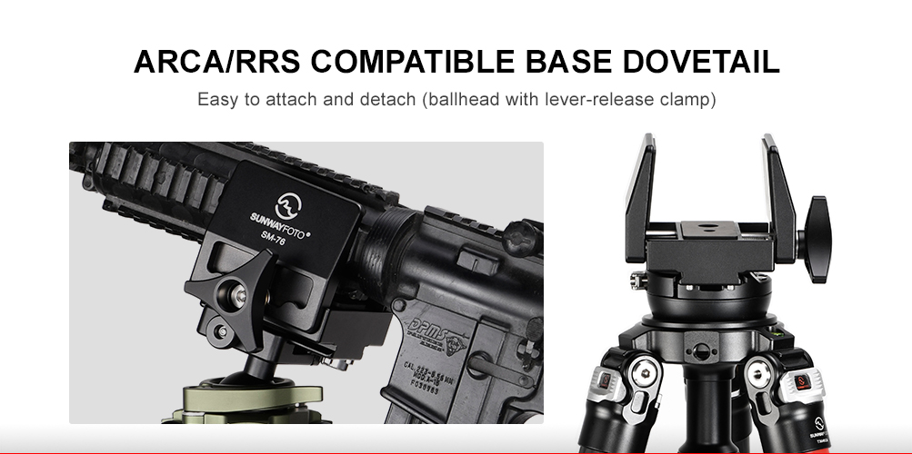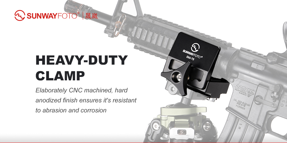 Sunwayfoto® SM-76 Equipment Mount ett mycket stabilt och robust vapenfäste (riflemount) med Arca-Swiss kompatibelt Dovetail-fäste för snabb och smidig montering i ett snabbfäste. Vapenfästet (Heavy-Duty Clamp) är tillverkat i en aluminiumlegering, med en hårdanodiserad yta (typ III), som i princip uppfyller militära specifikationer på korrosionsbeständighet och hållbarhet. Sunwayfoto® SM-76 Equipment Mount är ett optimalt hjälpmedel för jägare och skyttar, som eftersträvar mycket hög precision och träffsäkerhet. Vapenfästet placeras på t.ex ett stabilt stativ, med kulled och snabbfäste som klarar vapnets vikt. Det blir en betydligt stabilare plattform än andra typer av skjutstöd. Vapenfästet har stora gummerade anläggningsytor, bergfast låsning och en klämbredd mellan cirka 29-67mm. På undersidan av vapenfästet finns ett Arca-Swiss kompatibelt Dovetail-fäste, samt 3/8" - och 1/4" gängor.