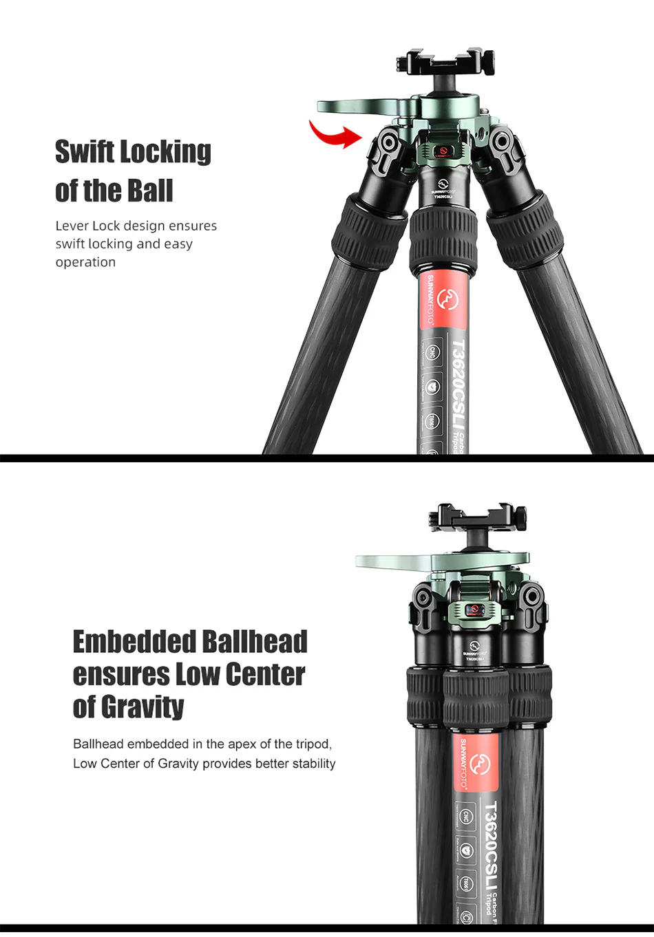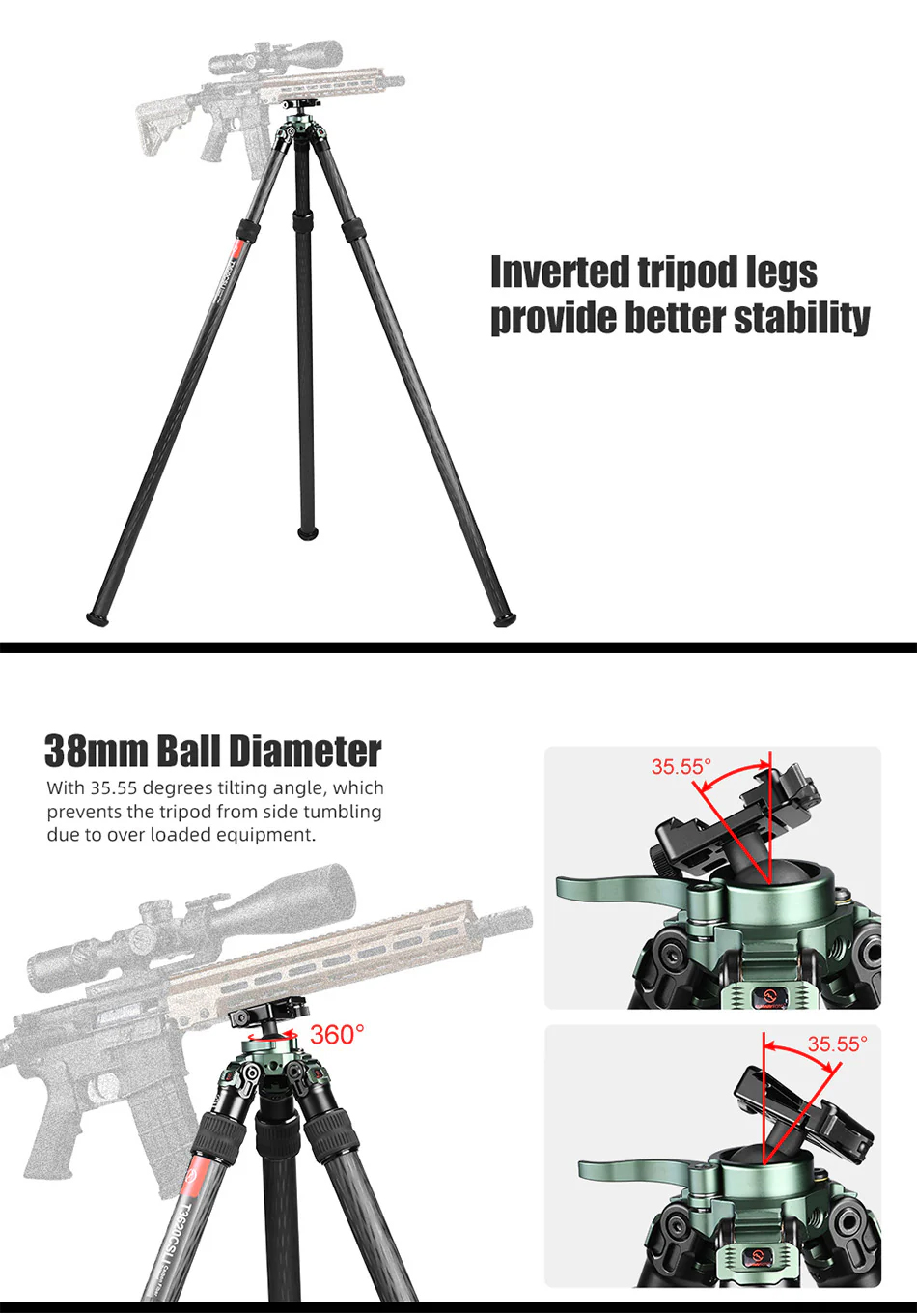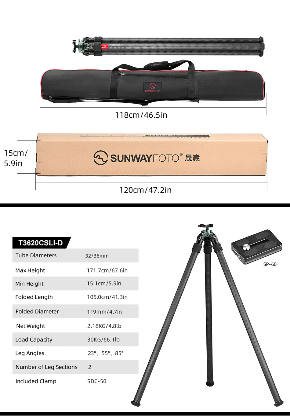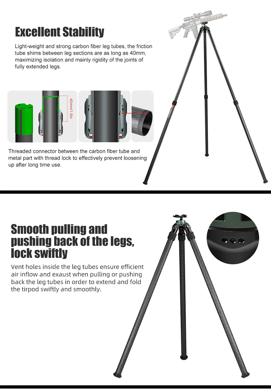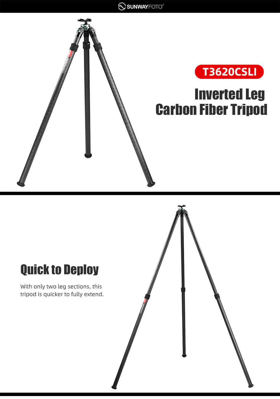 Sunwayfoto T3620CSLI-D Carbon Hunting tripod är ett mycket stabilt kolfiberstativ (skjutstöd), med senaste inverted-leg-konstruktion med den grövsta bensektionen (Ø36mm) underst för maximal stabilitet och lägre tyngdpunkt på stativet. (Vanliga skjutstöd och stativ har den smalaste sektionen underst.) En annan stor fördel när det gäller stabiliteten är att stativet har endast två bensektioner och ett benlås per ben, vilket dessutom gör uppställningen snabbare. Max belastningen är imponerande 30 Kg.