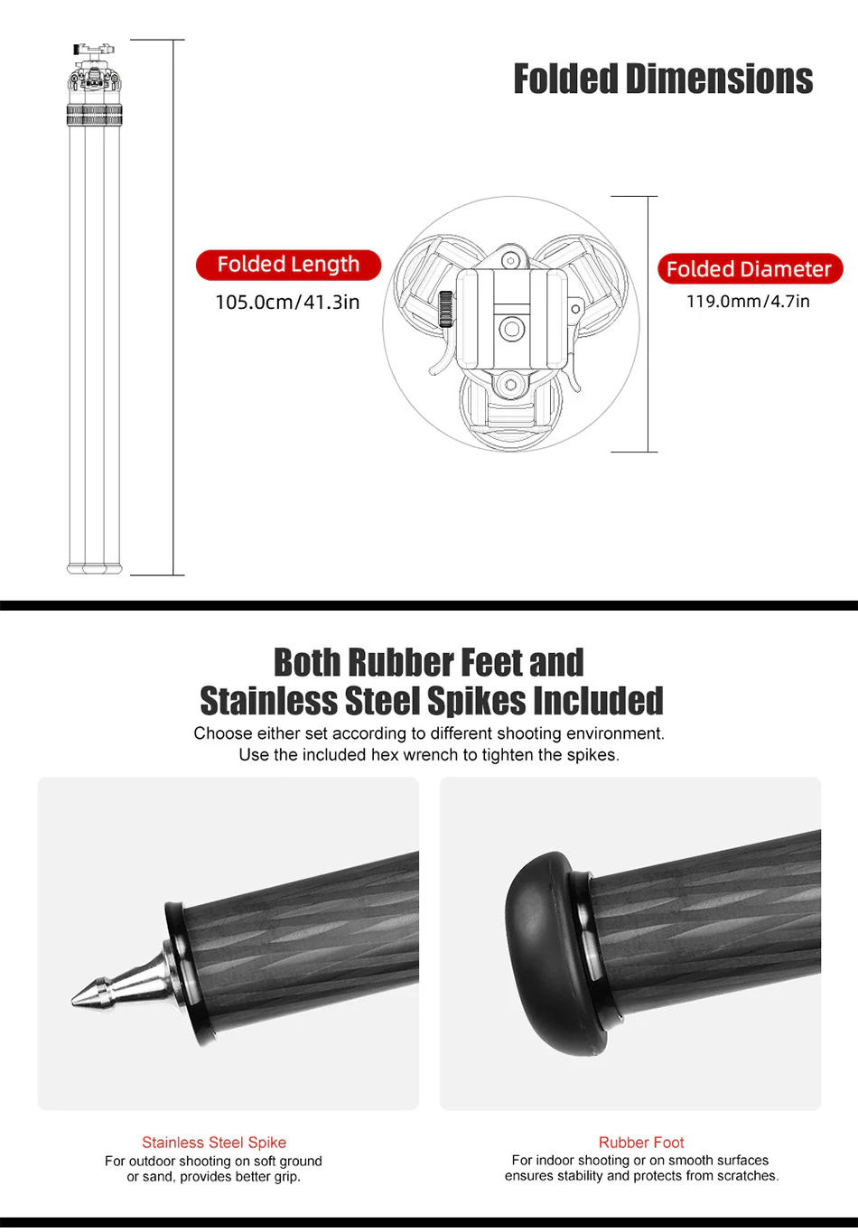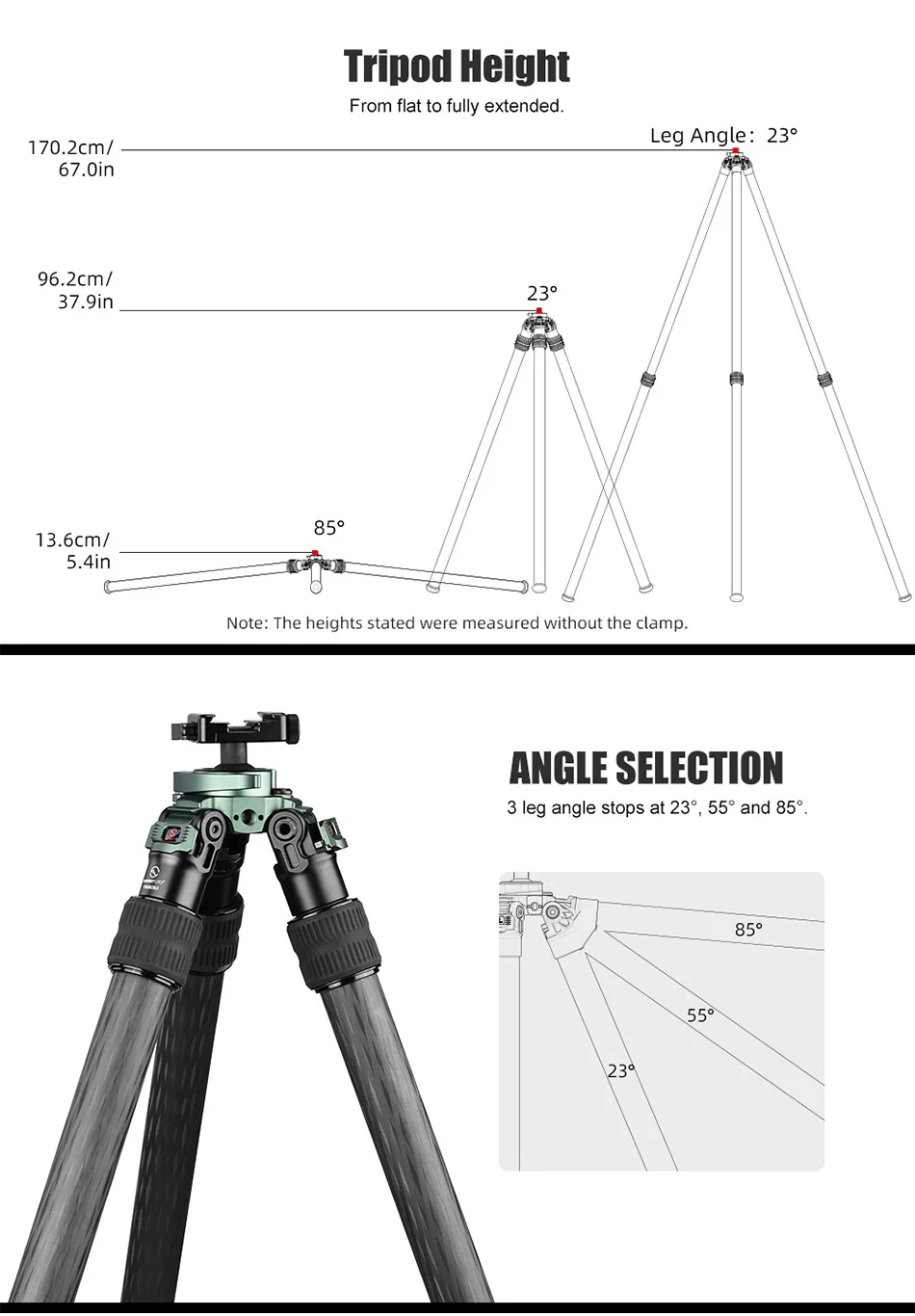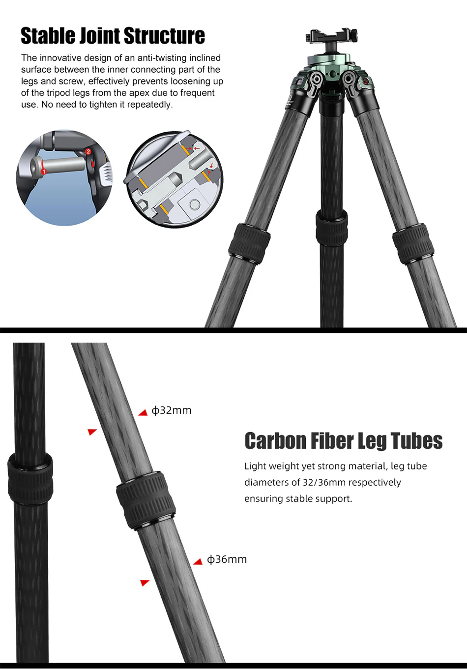 Stativet är tillverkat av kolfiber och T6061 aluminium, med en hårdanodiserad yta, som uppfyller mycket höga krav på korrosionsbeständighet och hållbarhet. Stativbenen är utdragbara i tre sektioner, med Quick Twist-låsning, som gör att det räcker att vrida benlåset ett 1/4 varv för bergfast låsning. Låsningen för benvinklarna har en smart och patenterad Auto Spring-Back funktion, som gör det smidigt att snabbt ändra benvinkel på stativbenet. Dra låset rakt ut  så att det klickar till och stannar i öppet läge. Ändra benvinkeln på benet och tryck till på låset så låser det sig automatiskt. Stativet har ställbara benvinklar från spagat (85°), halvspagat (55°) till normalläge (23°).