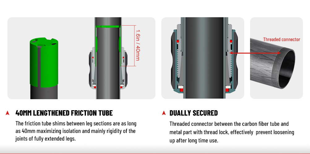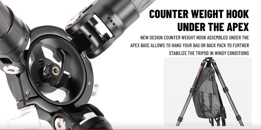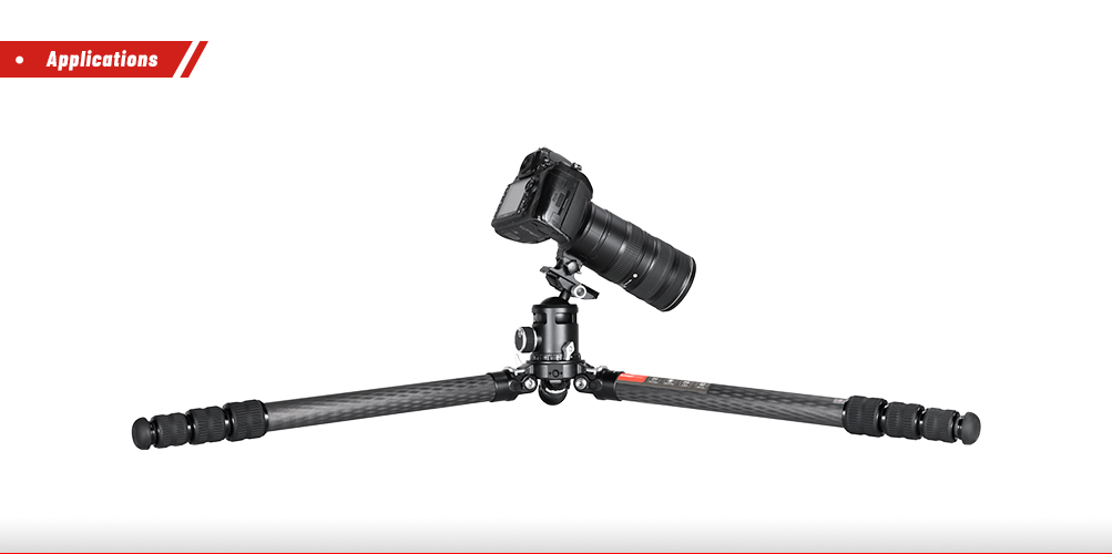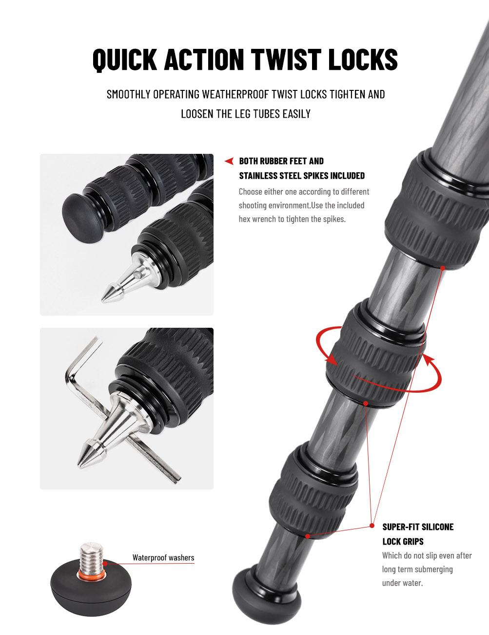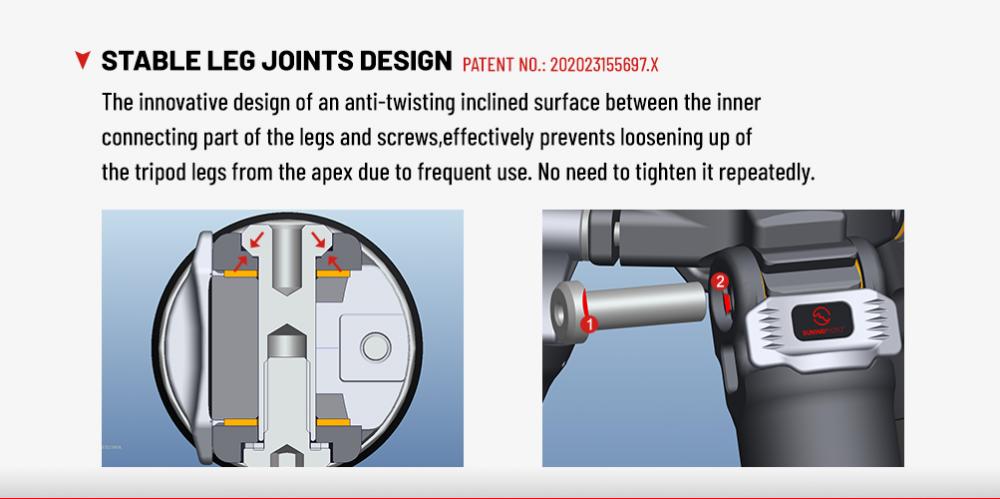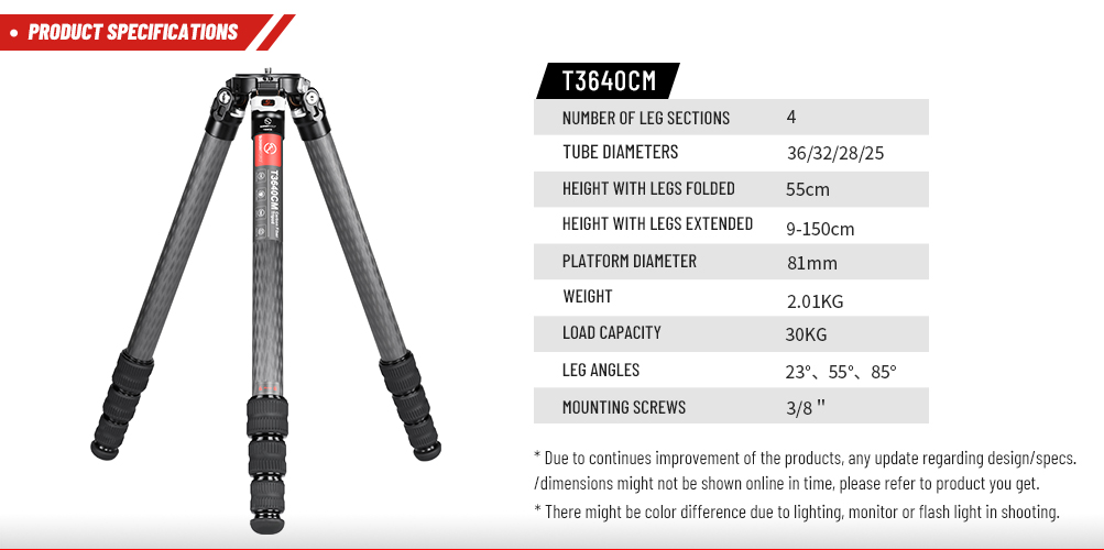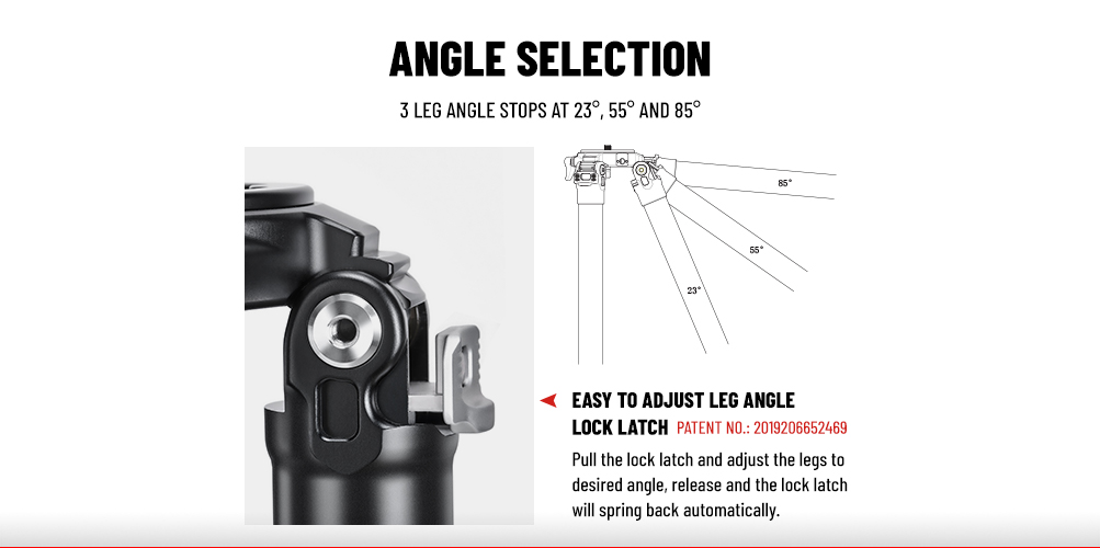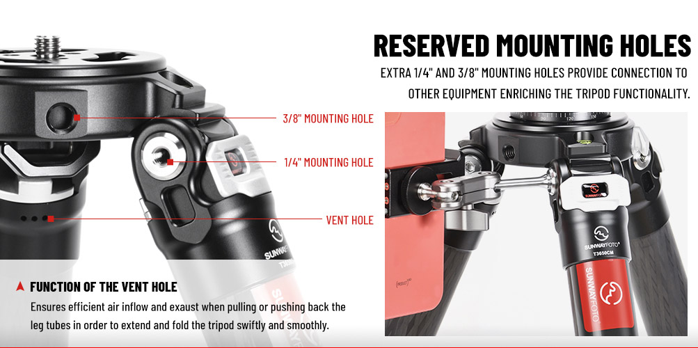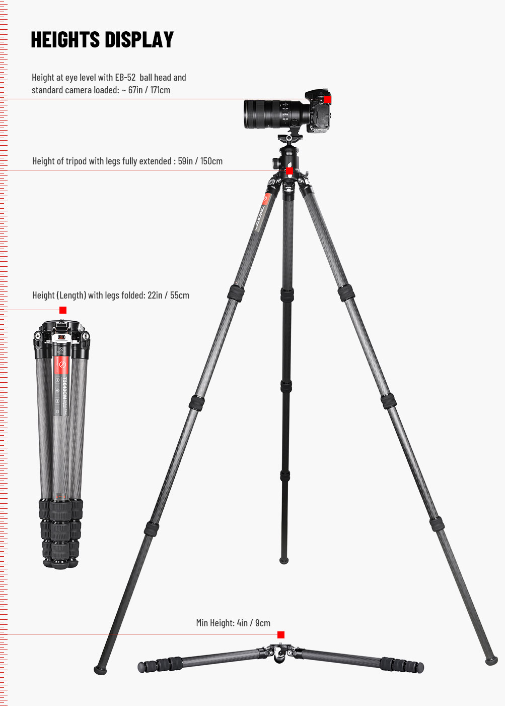 Låsningen för benvinklarna har en smart och patenterad Auto Spring-Back funktion, som gör det smidigt att snabbt ändra benvinkel på stativbenet. Dra låset rakt ut så att det klickar till och stannar i öppet läge. Ändra benvinkeln på benet och tryck till på låset så stängs det automatiskt. Stativet har ställbara benvinklar från spagat (85°), halvspagat (55°) till normalläge (23°). I spagat-läget så blir stativhöjden bara 9cm över marknivån! Stativbenen är utdragbara i fyra bensektioner, med praktisk Twist-Lock låsning, vilket ger stativet en maxhöjd på cirka 150 cm vid fullt utdrag och normal benvinkel. (Om man köper till en kulled, så hamnar kamerans sökare på cirka 170cm). Sunwayfoto® T3640CM är försedd med extra 1/4" och 3/8" gängor, som gör det möjligt att montera t.ex tillbehörs-armar mm på stativet. Stativet levereras med såväl gummifötter som spikfötter i rostfritt stål. Stativväska ingår.