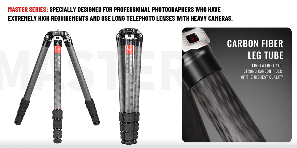 Sunwayfoto® T3640CM Master är ett extremt stabilt kolfiberstativ (10 lagers Carbon) för yrkesbruk där det ställs mycket höga krav på utrustningen. Stativet har patenterad konstruktion, med vädertätade lås, som effektivt minimerar risken att sand, damm och vatten tränger in i låsningen på stativet. Det är ett extremt stabilt kolfiberstativ (max höjd: 150cm), som är specificerad för en imponerande maxvikt på 30 Kg och klarar utan problem långa teleobjektiv. Sunwayfoto® T3640CM har nämligen avsevärt kraftigare och stabilare ben än vanliga kolfiberstativ . Stativet kan användas professionellt för både fotografering och för videofilmning. Stativen har en avtagbar plattform, med snabblåsning, som gör konverteringen från kamera- till videostativ snabb och säker. Plattformen kan nämligen bytas ut mot en 75mm skål (Bowl).