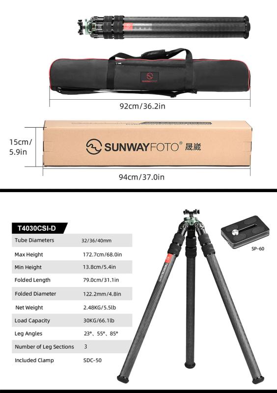 Sunwayfoto T4030CSI-D Carbon Hunting tripod är ett mycket stabilt kolfiberstativ (skjutstöd), med senaste inverted-leg-konstruktion med den grövsta bensektionen (Ø40mm) underst för maximal stabilitet och lägre tyngdpunkt på stativet. (Vanliga skjutstöd och stativ har den smalaste sektionen underst.) Sunwayfoto T4030CSI-D är ett av de absolut stabilaste skyttestativen på marknaden och har en specificerad max belastning på imponerande 30 Kg. Stativet har en integrerad Ø38mm kulled med snabblåsning (Swift Locking via spak) vilket gör det möjligt att rotera (360°) och tilta vapnet upp till 35 grader vid målföljning. Kulleden har lågprofil-design, vilket ger lägre tyngdpunkt och högre stabilitet än en vanlig kulled. Det går att använda kulleden "halvlåst" för att öka på friktionen. Snabbfästet (SDC-50) på kulleden har Dual-design och är kompatibelt med både Arca-Swiss QR och Picatinny / Nato för montering av vapen, vapenfästen (Sunwayfoto® SM-76 Equipment Mount) eller tillbehör på stativet. Det går att köpa till Arca-Swiss kompatibla skenor för M-LOK (t.ex SMP-140, SMP-80) eller Arca-Swiss kompatibla skenor för Keymod (t.ex SKP-80, SKP-140). Snabbfästet SDC-50 har konventionell låsratt och en ställbar låsspak för snabbare användning.