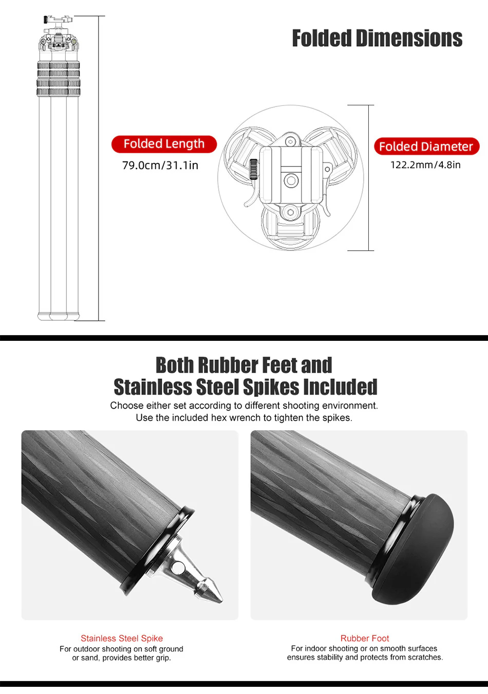 Stativet levereras med såväl gummifötter som spikfötter, vadderad väska och en Arca-swiss kompatibel kameraplatta.