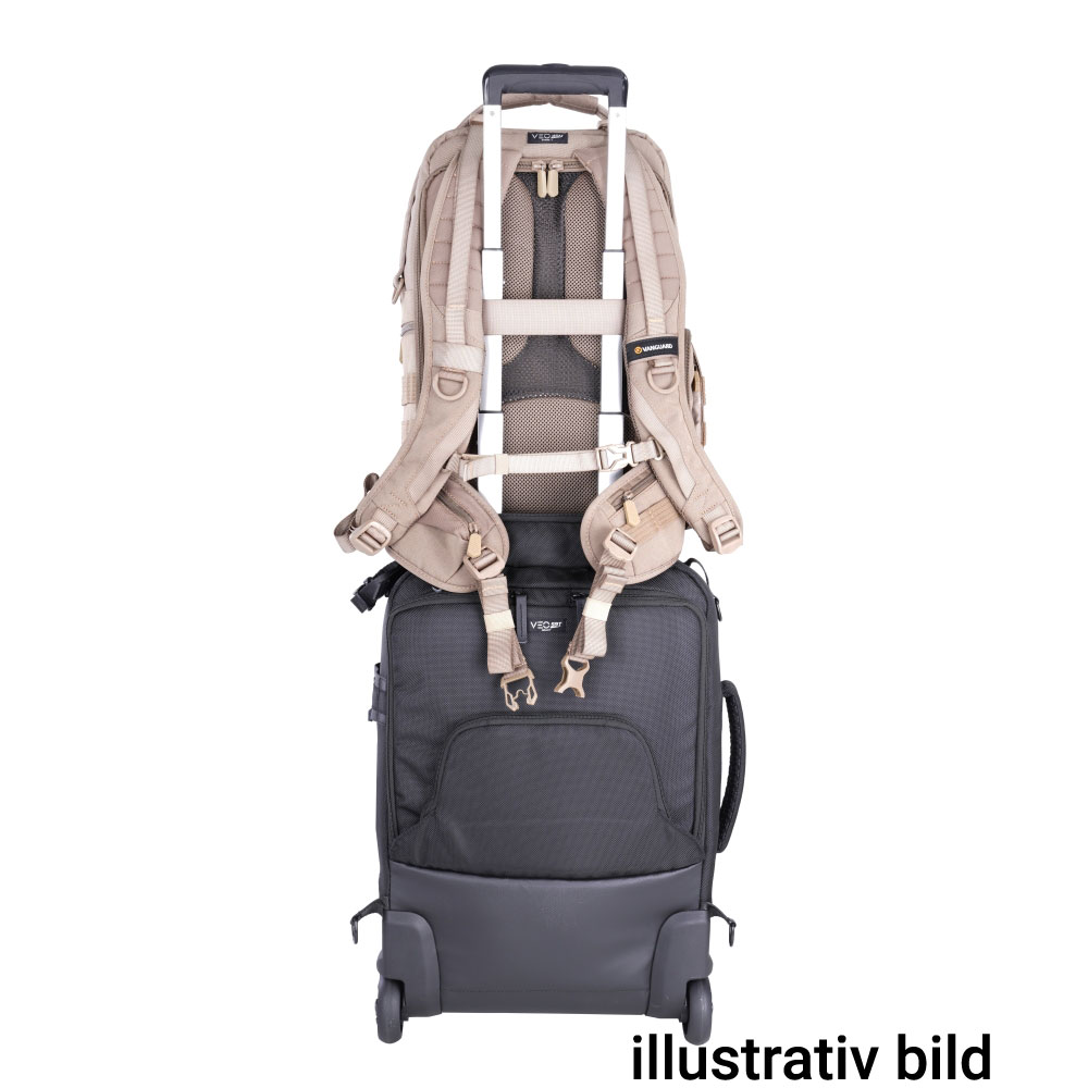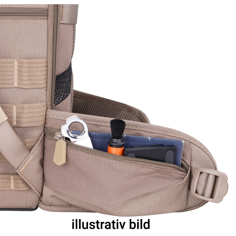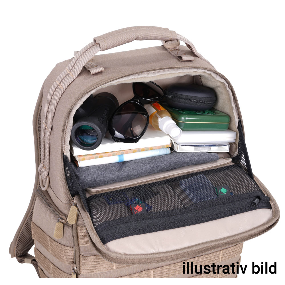 Ryggsäcken är kraftigt vadderad, med flyttbara avdelare, som gör det möjligt att anpassa väskan efter sin egen utrustning och önskemål. Ryggsäcken har en mycket smart design och öppnas primärt från ryggsidan istället för framsidan. Det gör det möjligt att öppna ryggsäcken på marken utan att ryggsidan blir smutsig. Det finns också snabbåtkomst via sidan, som gör att du kan komma åt utvalt utrustning utan att behöva ställa ner ryggsäcken på marken.